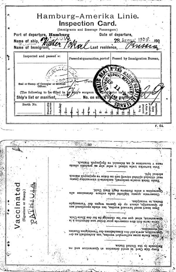 • He emigrated on 28 August 1908 from Hamburg. 264